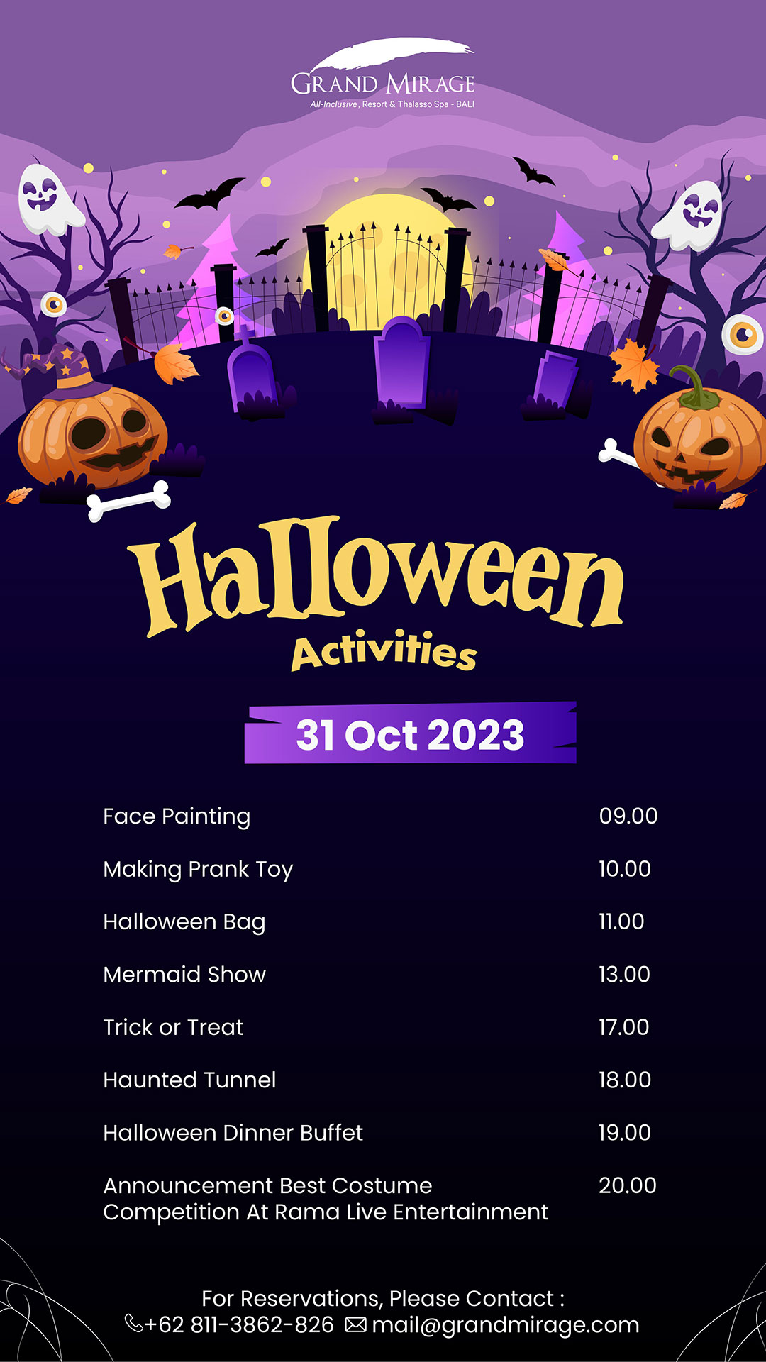 It's that spooky time of the year when both kids and adults love to dress up for all things Halloween! Let's celebrate Halloween at Grand Mirage Resort & Thalasso Bali. Our creative team will be transforming the resort into a magical place, and there will be several exciting activities from 09.00 AM until evening.